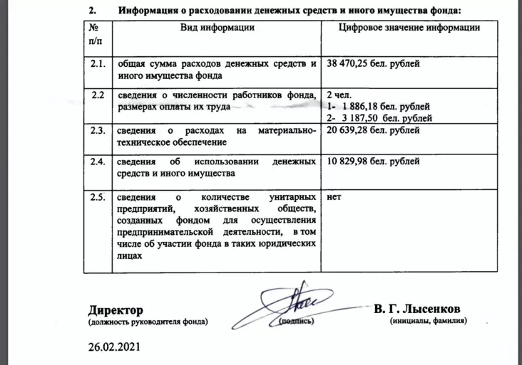 Пра справаздачу за 2020 год Лысенкоў адказаў коратка: «Я не бухгалтар, справаздачу не падаваў. Мая задача — арганізатарская».