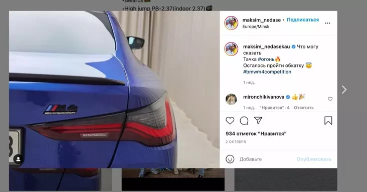 Фотаздымкам часткі аўто падзяліўся сам Недасекаў у сваім Інстаграме. Выглядае, што ён стаў уласнікам БМВ мадэлі «M4 Competition».