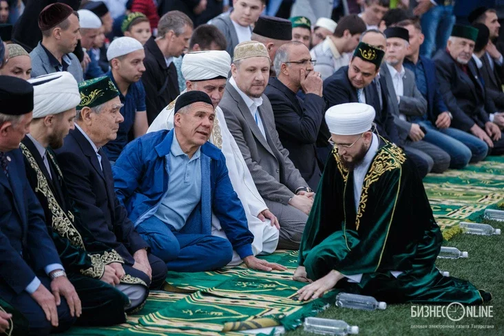 Рустэм Мініханаў (у сінім гарнітуры) і, злева ад яго экс-прэзідэнт Татарстана Менцімер Шайміеў на рэлігійнай цырымоніі. Фота з Islamnews.ru