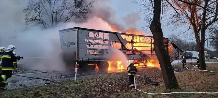 Сёння раніцай на польскай дарозе Беласток — Аўгустуў сутыкнуліся дзве фуры, піша тэлеграм-канал Newgrodno.by. Адна з іх пасля ўдару загарэлася.