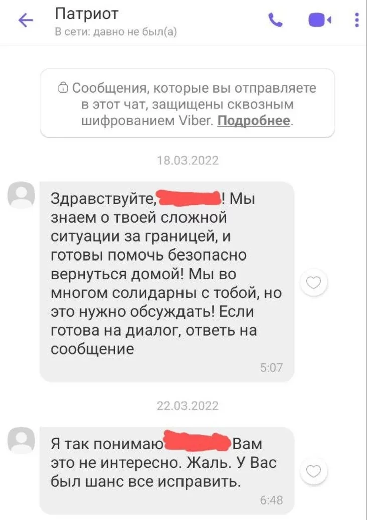 Наша трэцяя суразмоўца кажа, што атрымала прапанову «бяспечна вярнуцца на радзіму» яшчэ ў пачатку лютага гэтага года. Дзяўчына вяла дыялог, але ад супрацоўніцтва ўсё адно адмовілася.