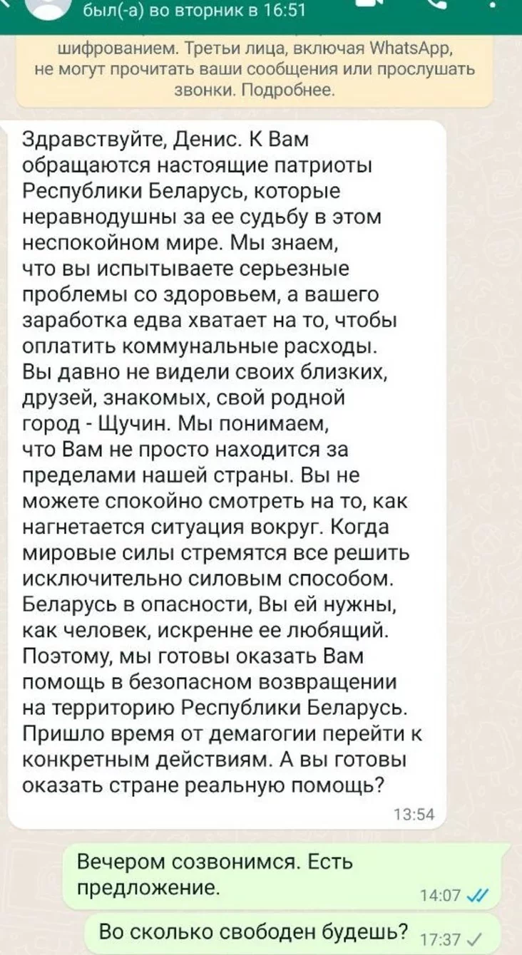 Яшчэ адзін наш чытач, які атрымаў паведамленне падобнае па змесце, таксама быў затрыманы ў жніўні 2020 года. Восенню таго ж года малады чалавек з'ехаў у Польшчу. Прапанова паступіла яму 19 красавіка 2022 года. Дзянісу напісалі ў WhatsApp. Аўтар паведамлення быў больш шматслоўны: