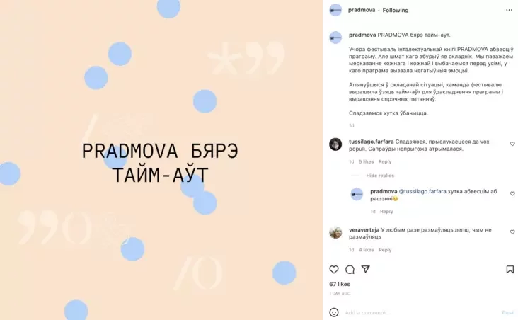 «Беларусы на беларускім фестывалі не мусяць цясніцца, каб даць прастору для выказвання расіянам, якімі б добрымі яны ні былі. Мы не можам сабе дазволіць пераймацца наконт культуры адмены і клапаціцца пра расіян, у нас хапае іншых, нашмат больш пільных для нас праблем. Расійская культура — гэта ўвогуле не наша праблема, яна нас не тычыцца.
