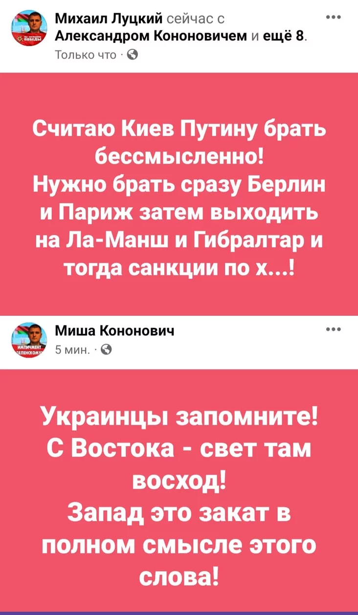 У сваіх відэа ў сацсетках яны, да прыкладу, агітавалі ваяваць з НАТА, пісалі, што «вызваленне Украіны прыйдзе з усходу», і падобныя рэчы.