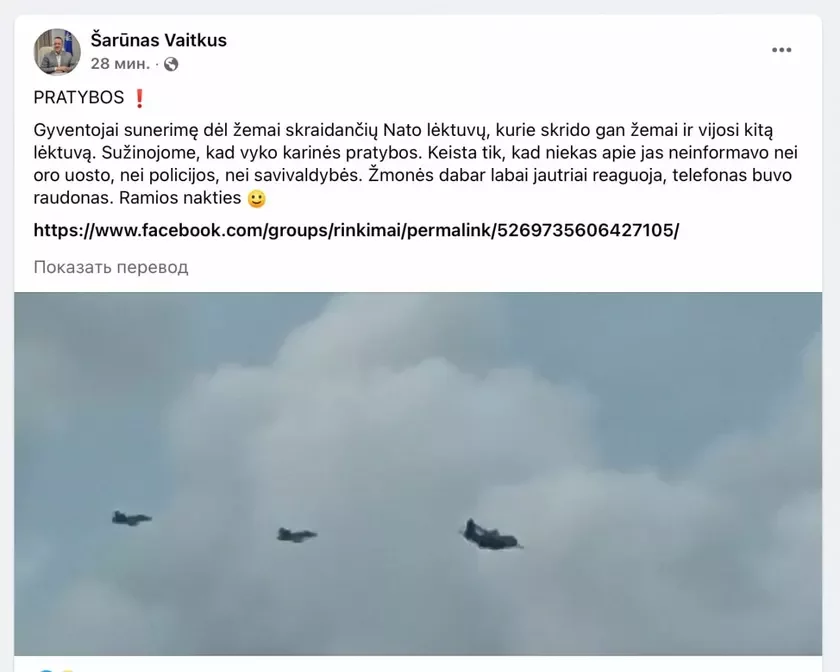 Толькі неўзабаве мэр горада Паланга Шарунас Вайткус паведаміў, што на літоўскім узмор'і ў раёне Клайпеды, аказваецца, праходзілі «вучэнні, пра якія ні жыхароў, ні прадстаўнікоў улады ніхто не папярэдзіў». Знішчальнік НАТА выпускаў падчас іх сігнальныя ракеты.