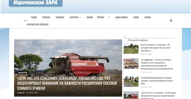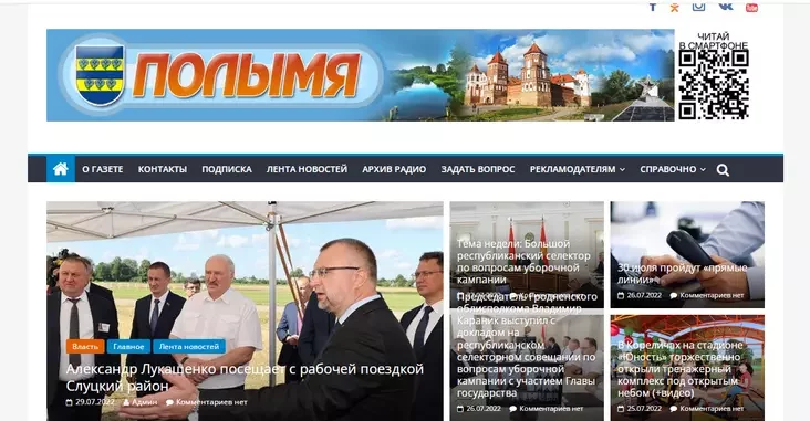 Ідзем па карэліцкія навіны на сайт мясцовай раёнкі «Полымя» — і ледзьве бачым розніцу з мінулымі рэсурсамі з падборкі. Сайты падобныя адзін да аднаго, як блізняты: Лукашэнка на галоўнай старонцы, інфармацыя ад ДАІ і з буйных дзяржрэсурсаў, уборачная і БРСМ.