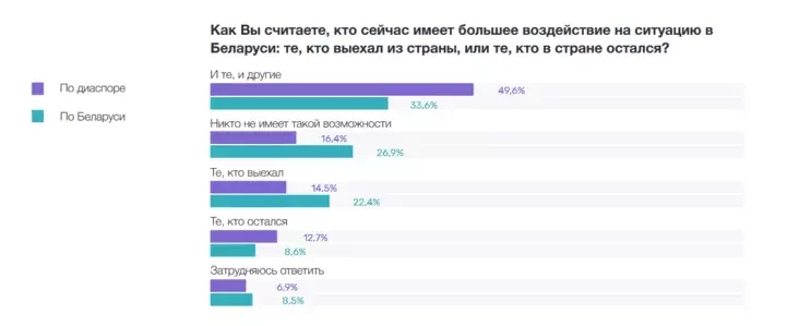 Адно з пытанняў — хто цяпер мае больш магчымасцяў уздзейнічаць на сітуацыю ў Беларусі. Найбольш распаўсюджаным адказам з’яўляецца дастаткова аптымістычны варыянт: «і тыя, і іншыя». Сярод беларусаў, якія з’ехалі, такі варыянт выбрала амаль палова рэспандэнтаў (49,6%), а сярод тых, хто застаўся ў краіне, — траціна (33,6%).