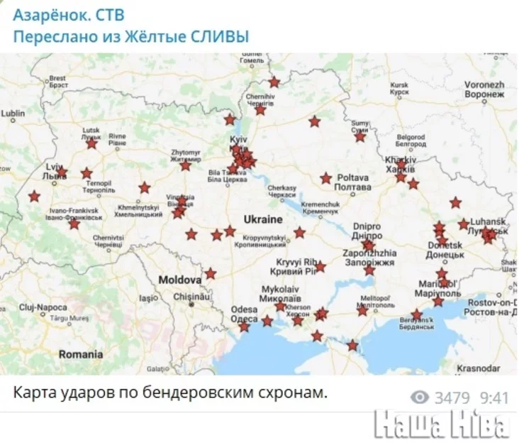 Не спаў у тую ноч і Азаронак. Пачынаючы з пяці ранку прапагандыст таксама рабіў рэпосты паведамленняў розных каналаў аб паспяховых ударах расійскіх войскаў па вайсковай інфраструктуры Украіны. У 9:41 ён перапосціў з канала «Жоўтыя злівы» «Карту ўдараў па бендэраўскіх схронах».