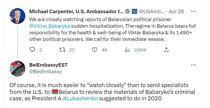 На допіс у твітары прадстаўніка ЗША ў АБСЕ Майка Карпентэра, датычны шпіталізацыі Віктара Бабарыкі са слядамі збіцця з наваполацкай калоніі ў мясцовую бальніцу нечакана адрэагавала Беларуская амбасада ў Эстоніі.