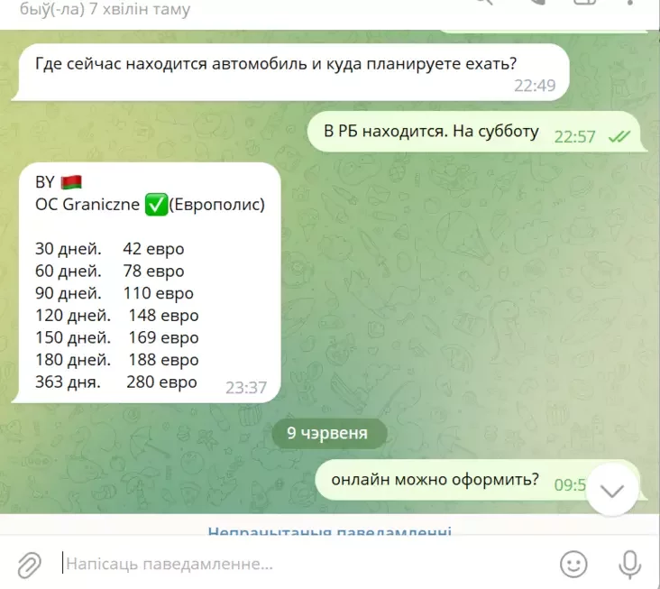Апроч таго, агентаў, якія гатовыя выпісаць польскую страхоўку анлайн, можна знайсці ў адмысловых чатах у тэлеграме. Страхоўка на 30 дзён у іх каштуе 42 еўра ў той час, калі самы танны поліс на 30 дзён у Польшчы каштуе 140 злотых (каля 31,5 еўра).