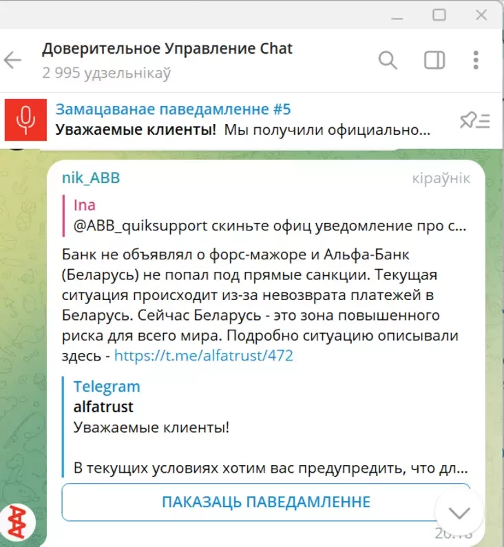 Некалькі соцень беларусаў, якія карысталіся паслугамі давернага кіравання ад Альфа-Банка, аказаліся без грошай, бо яны засталіся замарожаныя заходнімі брокерамі. У адмысловым чаце ў тэлеграме налічваецца больш за 800 удзельнікаў, якіх аб'ядноўвае адна праблема.