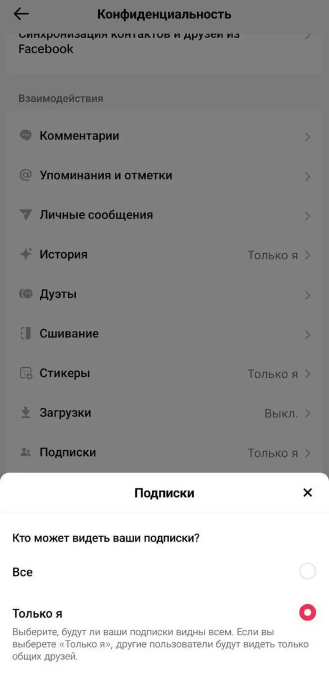 Вярніцеся і перайдзіце ў пункт «Сінхранізацыя кантактаў і сяброў з Facebook». Падумайце, ці хочаце вы, каб людзі з вашай кантактнай кнігі або фрэндліста фэйсбука маглі знайсці вас у тыктоку. Адключыце гэтую опцыю.