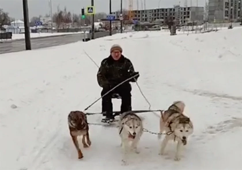 В тиктоке вирусится ролик, на котором мужчину по улице тянут трое животных.