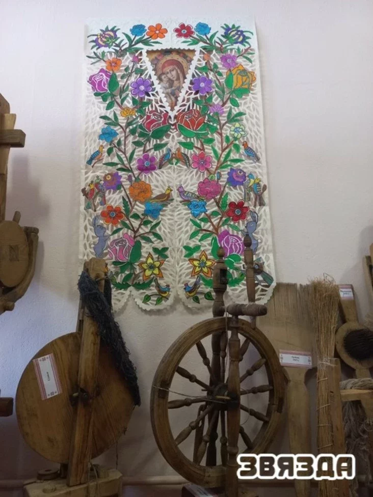 Потым разварочвае, падмалёўвае другі бок, дзе адбіліся такія ж узоры. І, лічы, выцінанка гатовая. Засталося толькі падабраць пад яе абраз і акуратненька прымацаваць іголачкамі да шпалераў.