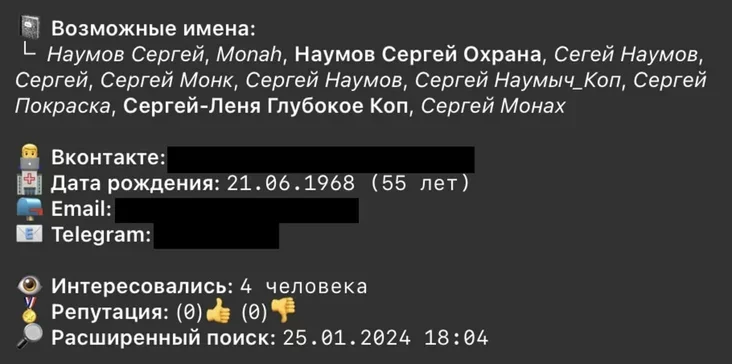 Акаўнт мужчыны слаба абаронены і прывязаны да ўласнага беларускага нумару. А нехта (імаверна, губазікаўцы ці іншыя спецслужбісты) зрабіў платны «пашыраны пошук» (дазваляе атрымаць троху больш інфармацыі) па ягоным акаўнце ў тэлеграм-боце «Вока Бога» ў студзені 2024 года. Гэта звычайна значыць, што чалавек ужо на кручку і яго затрыманне — пытанне часу.