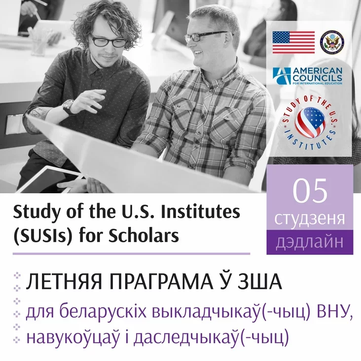 Летнія інстытуты па амерыканістыцы (SUSIs for Scholars) прапануюць чатыры тыдні акадэмічнай рэзідэнцыі на базе амерыканскага ўніверсітэта і тыднёвую інтэграваную навучальную паездку ў адзін з рэгіёнаў ЗША.