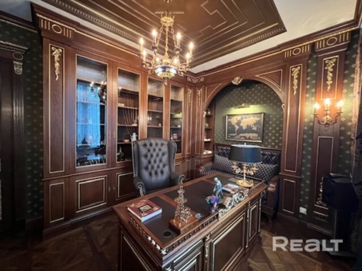 Інтэр'ер у палацавым стылі з італьянскай мэбляй. На ўчастку аўтарскі ландшафтны дызайн і ўласная сажалка. Уражваюць як інтэр'еры, так і кошт.