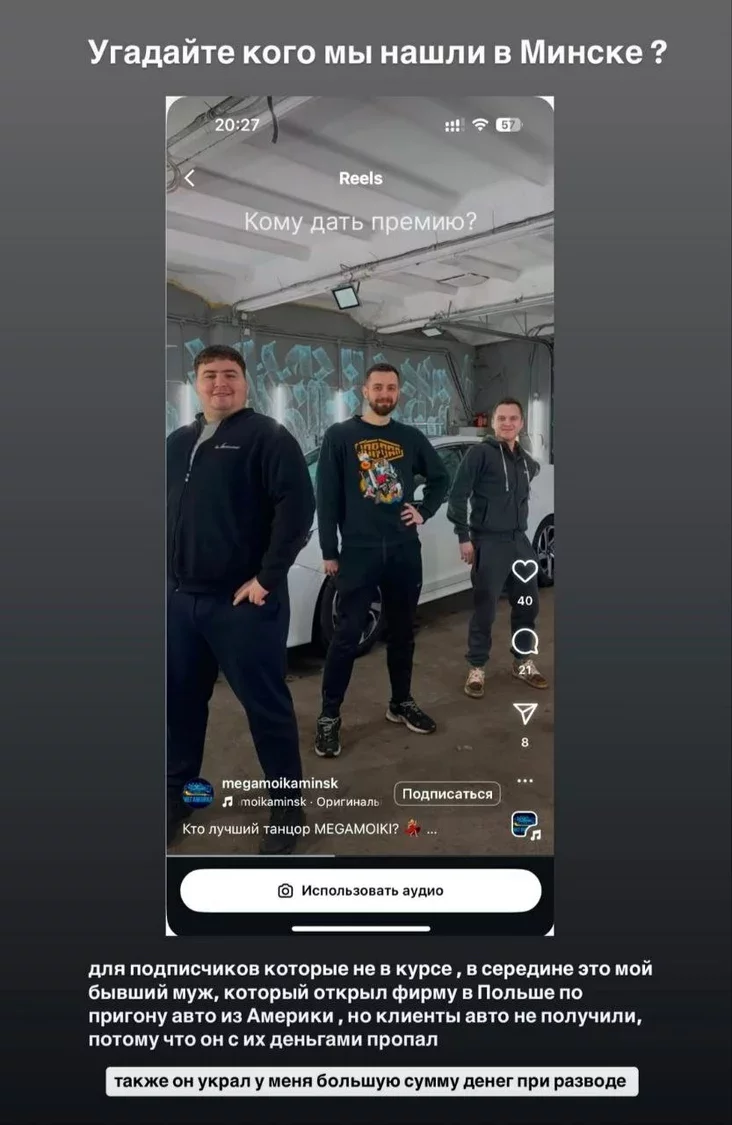 І вось цяпер бягуха заўважыла, што былы каханы спакойна танчыць у рылсе мінскай «Мегамыйні» на вуліцы Караля. У подпісу да жартлівага відэа пытаюцца: «Каму даць прэмію?». Дарэчы, апублікаваны ён 21 студзеня.