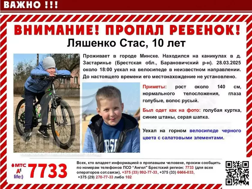 Стас Ляшэнка жыве ў Мінску, але на канікулах знаходзіўся ў вёсцы Застарынне Баранавіцкага раёна. 28 сакавіка каля 18:00 ён паехаў на ровары ў невядомым кірунку, і дзіця дагэтуль не знайшлі, пішуць валанцёры.