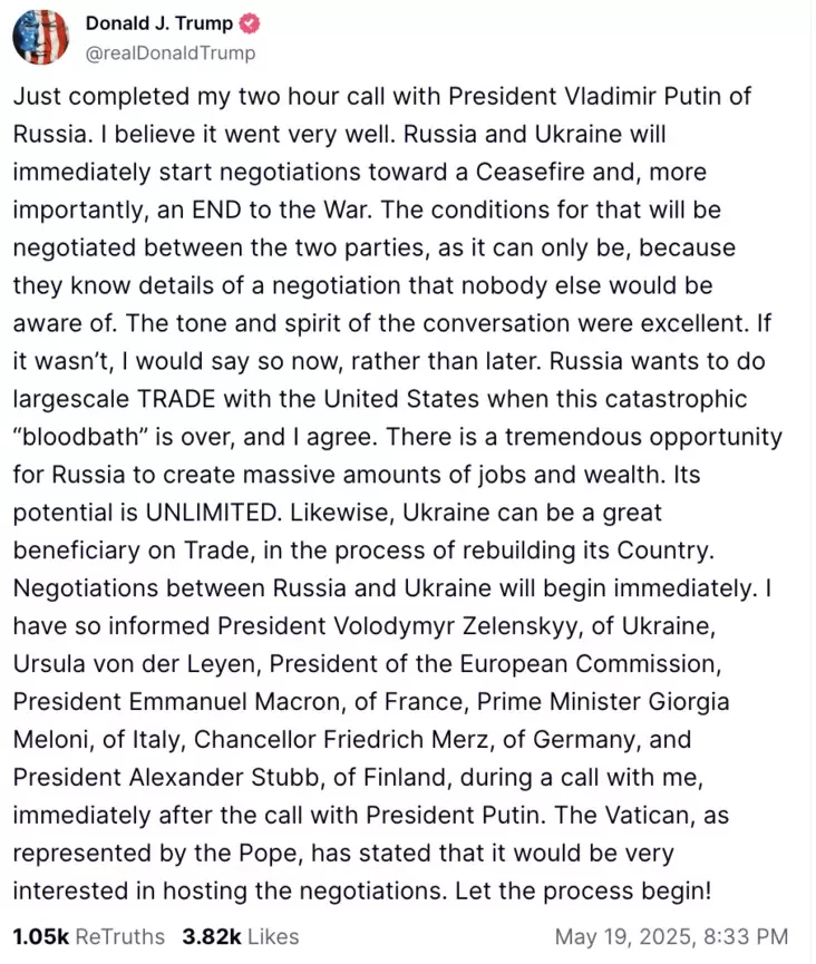 Перамовы паміж Расіяй і Украінай пачнуцца неадкладна. Я паведаміў пра гэта прэзідэнту Украіны Уладзіміру Зяленскаму, прэзідэнту Еўрапейскай камісіі Урсуле фон дэр Ляен, прэзідэнту Францыі Эмануэлю Макрону, прэм’ер-міністру Італіі Джорджы Мелоні, федэральнаму канцлеру Германіі Фрыдрыху Мерцу і прэзідэнту Фінляндыі Аляксандру Стубу падчас тэлефоннай размовы адразу пасля гутаркі з прэзідэнтам Пуціным.