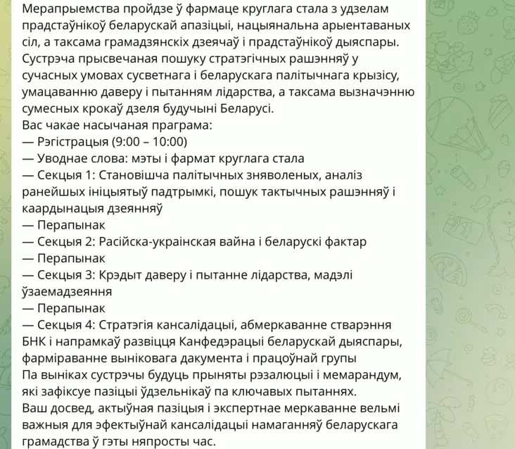 У форме рэгістрацыі на круглы стол, як і ў самім запрашэнні акцэнтуецца ўвага на тэме «крызіс даверу, пытанне лідарства». Хутчэй за ўсё, сярод іншага там будзе абмяркоўвацца пытанне даверу да Святланы Ціханоўскай і Паўла Латушкі — тэма, якая не дае спакою апанентам Офіса і НАУ. А ўсе асобы, якія ўжо прапіярылі падзею, славяцца крытыкай на адрас гэтых дэмакратычных сілаў.