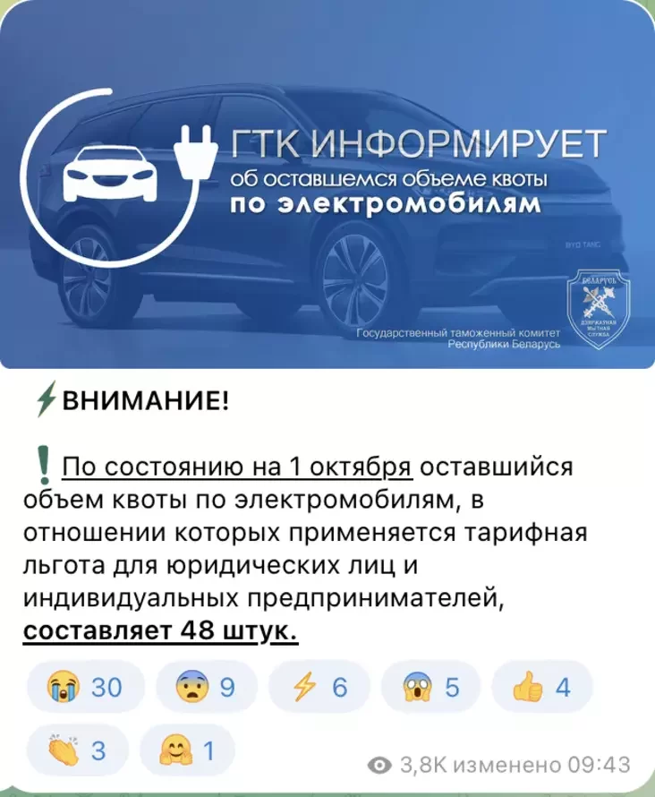 Аднак па стане на 1 кастрычніка 2025 года ў Беларусі вычарпалі квоты на бяспошлінны ўвоз электракараў.