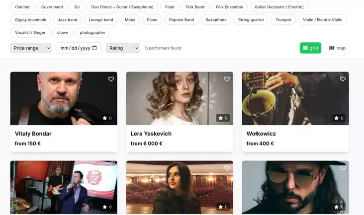 Так, за 6 тысяч еўра вы можаце запрасіць да сябе на дзень народзінаў спявачку Леру Яскевіч, адразу абраўшы патрэбную дату ў календары. За 500 еўра — коміка Антона Дзюбайлу, а за дзве тысячы еўра (за гадзіну) — самога Пятра Клюева. Сціплым яго назваць цяжка: сам сябе ён апісвае як «найлепшага поп-музыку ўсіх часоў» і «легенду».