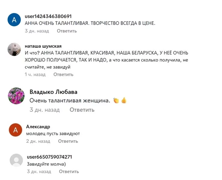 «Ганна вельмі таленавітая. Творчасць заўсёды ў цане», «І што? Ганна таленавітая, прыгожая, наша беларуска. У яе вельмі добра ўдаецца. Так і трэба. А што тычыцца, колькі атрымала, — не лічыце, не зайздросьце», «Малойца, няхай зайздросцяць».