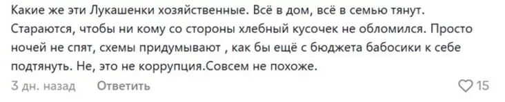 Адзін з карыстальнікаў разгарнуў гэтую думку ў больш іранічны каментар: «Якія ж гэтыя Лукашэнкі гаспадарлівыя. Усё ў дом, усё ў сям'ю цягнуць».