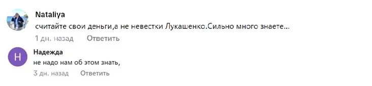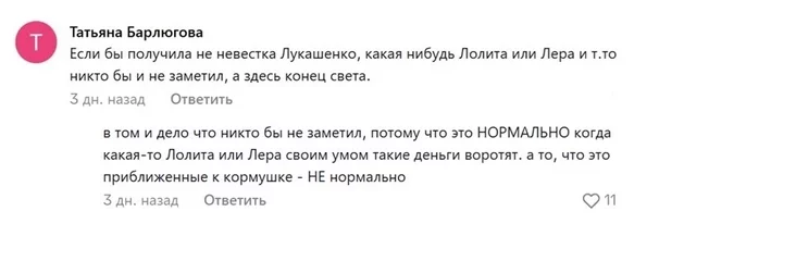 «Калі б такія грошы атрымала не нявестка Лукашэнкі, а якая-небудзь Лаліта ці Лера, то ніхто б і не заўважыў. А тут канец свету», — піша праўладны каментатар.