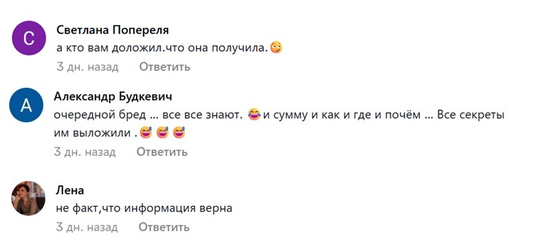 Трэцяя група ставіць пад сумнеў саму інфармацыю: «А хто вам сказаў, што яна атрымала», «Чарговае трызненне. Усе ўсё ведаюць. І сумы, і як, і дзе, і па чым…. Усе сакрэты ім выклалі», «Не факт, што інфармацыя праўдзівая».