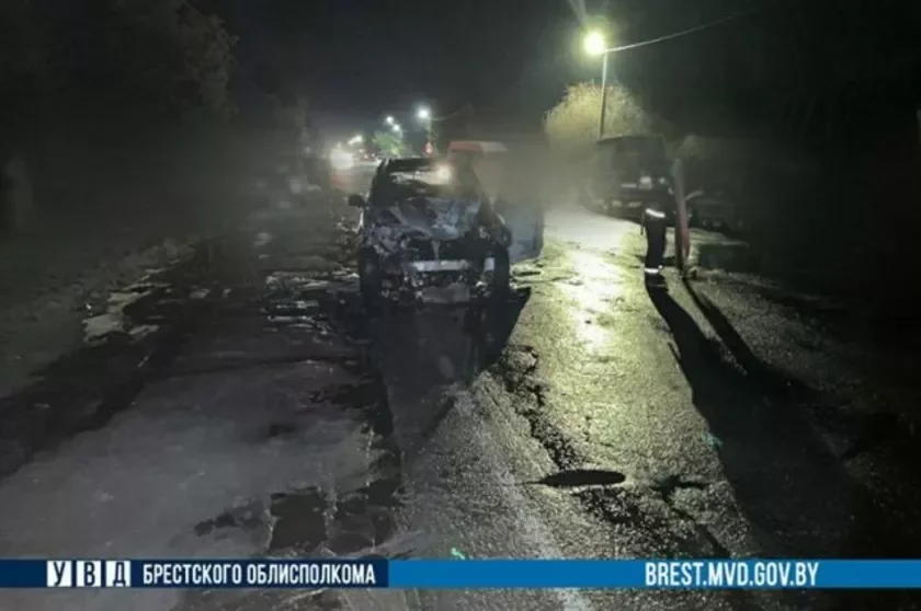 Аўтамабіль ад удару загарэўся, агонь патушылі супрацоўнікі МНС.