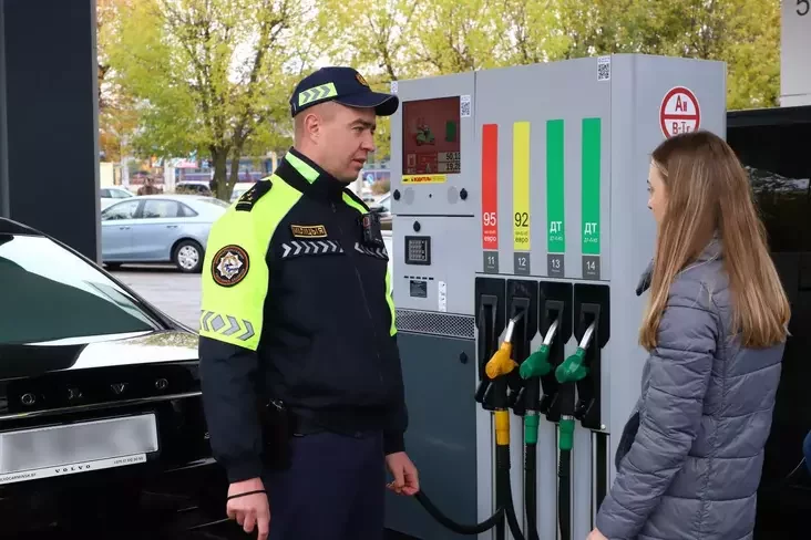 Прафілактычная гутарка рэйдавай групы наконт некантраляванага распіцця кавы на АЗС, 16 кастрычніка. Фота: прэс-служба МУС