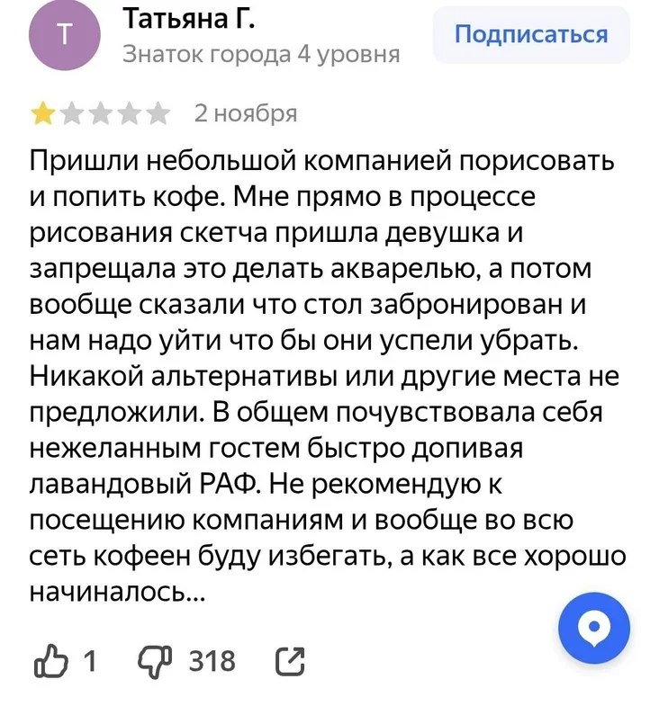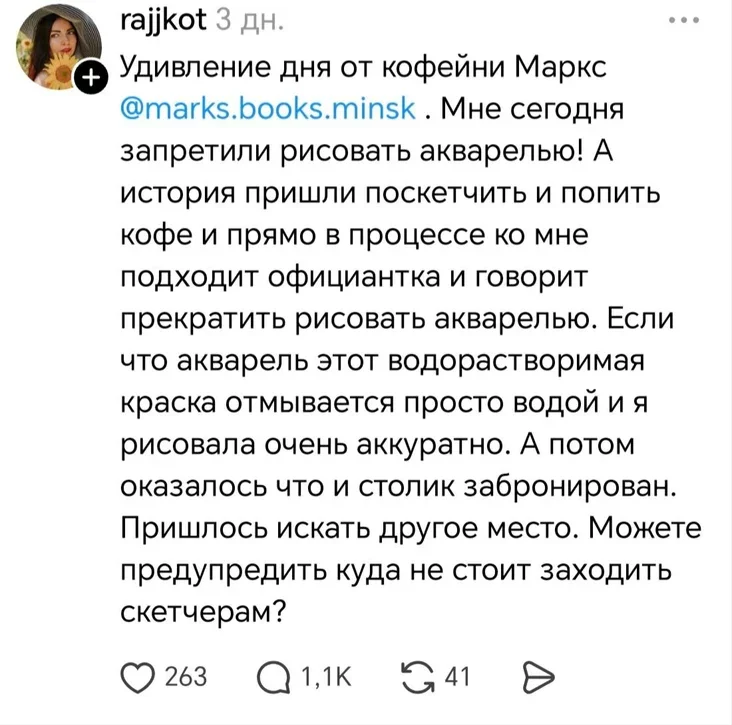 «Здзіўленне дня» ад кавярні «Маркс». Мне сёння забаранілі маляваць акварэллю! А гісторыя такая: прыйшла паскетчыць і выпіць кавы, і проста ў працэсе да мяне падыходзіць афіцыянтка і кажа спыніць маляваць акварэллю. Калі што, акварэль — гэта водарастваральная фарба, яна адмываецца проста вадой, і я малявала вельмі акуратна. А потым яшчэ аказалася, што столік быў забраніраваны. Давялося шукаць іншае месца. Можаце, калі ласка, падказаць, куды лепш не заходзіць скетчарам?»