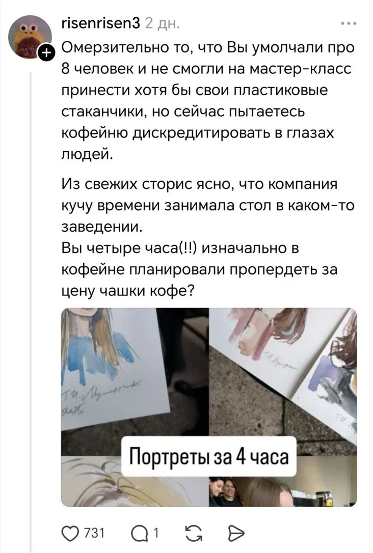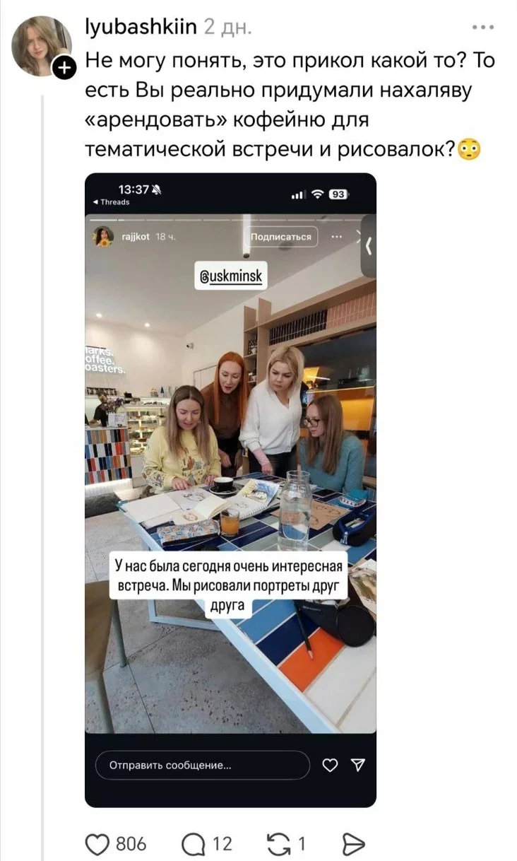 «Хачу ўдакладніць, што малявала не адна дзяўчына, а цэлая кампанія — чалавек восем. Яны сапраўды выкарыстоўвалі акварэль і ваду, прычым бралі для гэтага пітныя шклянкі, якія звычайна прызначаныя для гасцей. Усё адбывалася проста ў залі, за агульнымі сталамі, і выглядала хутчэй як майстар-клас, а не спакойны скетч. Думаю, адміністрацыя проста хацела захаваць парадак і чысціню — бо кавярня ўсё ж такі не каворкінг і не мастацкая студыя».