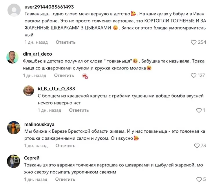 «Товканыця… Адно слова мяне вярнула ў дзяцінства. На канікулах у бабулі ў Іванаўскім раёне. Гэта не проста тоўчаная бульба, гэта КАРТОПЛІ ТОЎЧАНЫЯ І ЗАСМАЖАНЫЯ ШКВАРКАМІ З ЦЫБУХАМІ. Пах ад гэтай стравы надзвычайны».
