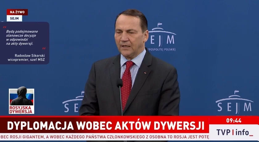«Я заявіў тады, што калі Расія не перапыніць свае дыверсійныя атакі на Польшчу, а Расія не толькі не спыніла, але і ўзмацняе гэтыя атакі. Як я ўжо сказаў у сваёй прамове, калі мэтай шпіёнства і дыверсійнай дзейнасці з’яўляюцца чалавечыя ахвяры, то мы маем справу ўжо не з дыверсіяй, а з дзяржаўным тэрорам. Таму гэта не будзе нашым поўным адказам, але я ўжо прыняў рашэнне адклікаць згоду на працу апошняга расійскага консульства ў Гданьску», — сказаў ён.