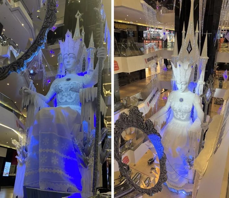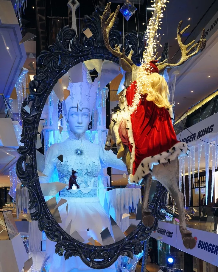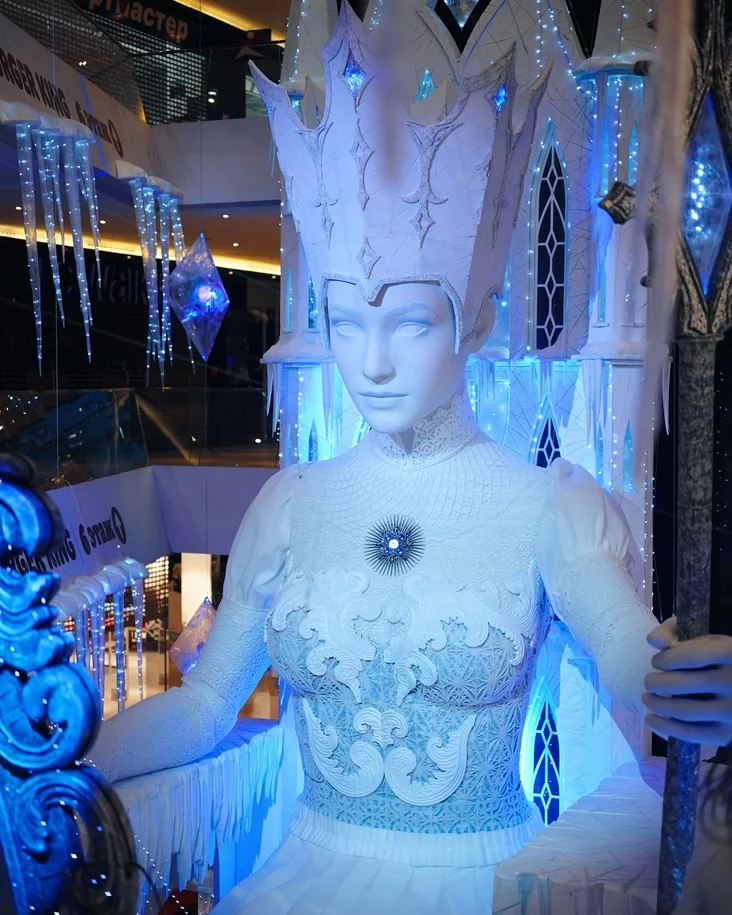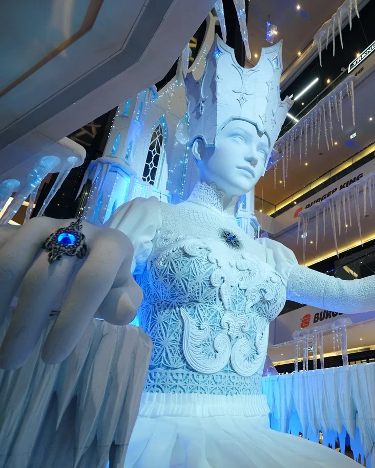 Цэнтральным аб'ектам кампазіцыі стала фігура самой уладаркі зімы, якая сядзіць на ледзяным троне. Снежная каралева ўзвышаецца над наведвальнікамі, пранізваючы прастору гандлёвага цэнтра праз некалькі паверхаў.