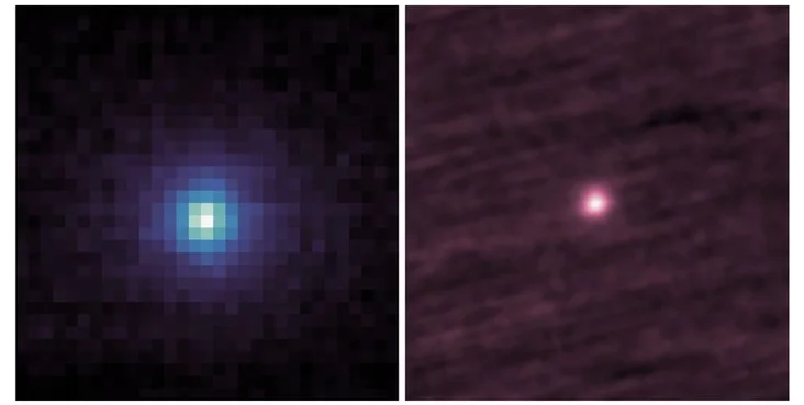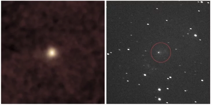 Камета 3I/ATLAS, зафіксаваная місіяй ESA/NASA SOHO 15—16 кастрычніка (злева) і знятая апаратам Lucy 16 верасня. Фота: Lowell Observatory / Qicheng Zhang; NASA / Goddard / SwRI / JHU-APL