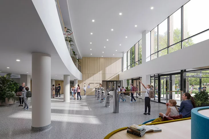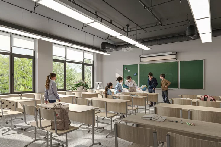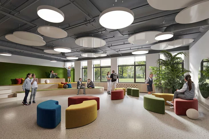 Для пачатковай школы ў двары забудоўшчык абсталюе вялікую гульнявую пляцоўку, а ў самой школе з'явяцца інтэрактыўныя зоны адпачынку для малодшых і старэйшых класаў.