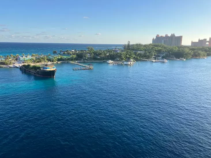 — Ужо пасля адплыцця з порту, пакуль карабель манеўраваў, я заўважыў, што з борта ў порце было бачна марское дно: прытым што асадка круізнага судна пры ўваходзе ў порт мінімум 8 метраў, а глыбіня порта — 10—12 метраў. Настолькі вось чыстая вада на Багамах.