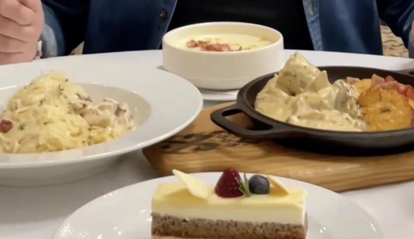 Мужчына заказаў крэм-суп з сельдэрэем і беконам, карбанару, мачанку з дранікамі, каўбаскамі і грыбным соўсам. Таксама быў дэсерт і свежавыціснуты сок. Цэны на пазіцыі такія: суп — Br13, мачанка — Br46, спагеці — Br22, двайны сок — Br7, дэсерт — Br10.