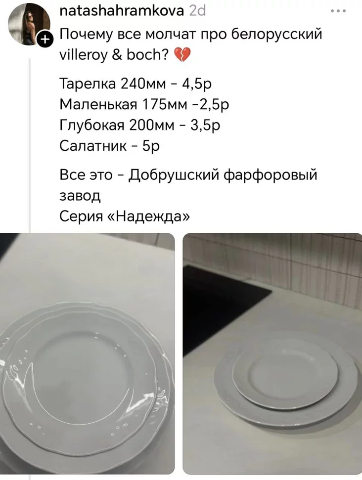 «Чаму ўсе маўчаць пра беларускі Villeroy&Boch?» — напісала яна і дадала цэны. Талеркі каштуюць танна — ад 2,5 да 5 рублёў. Для параўнання: талерачкі ад таго самага Villeroy&Boch (нямецкі брэнд керамікі, які існуе з 1748 года) лёгка могуць каштаваць у Мінску і 100, і 200 рублёў за штуку.