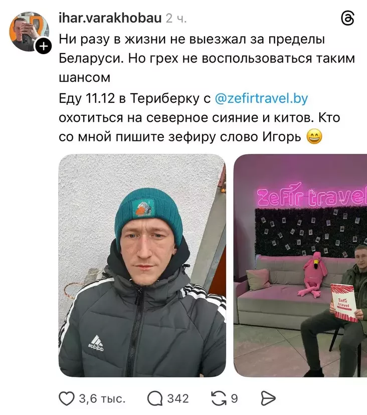 А пакуль мужчына знаходзіцца ў зеніце сваёй раптоўнай славы, ён карыстаецца яе «бонусамі». Нядаўна ён напісаў у Threads, што 11 снежня ад адной з турыстычных кампаній едзе ў Цярыберку, што ў Мурманскай вобласці, — «паляваць на паўночнае ззянне і кітоў».