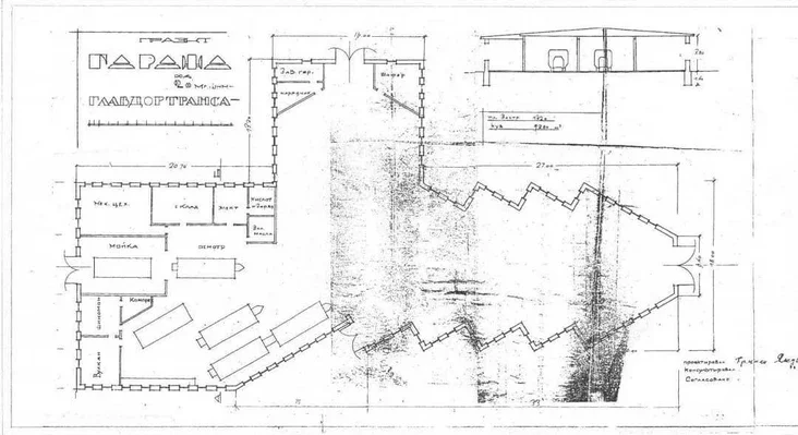 На арыгінальным праекце Якушкі відаць, што гаражы мелі чатыры выезды, размешчаныя адзін насупраць аднаго. У адной частцы будынка знаходзілася зона абслугоўвання з памяшканнямі вулканізацыі, шынамантажу з кампрэсарам, механічным цэхам, аглядным месцам і мыйняй. У другой частцы будынка былі толькі невялікія памяшканні, прызначаныя для загадчыка гаража і шафёра.