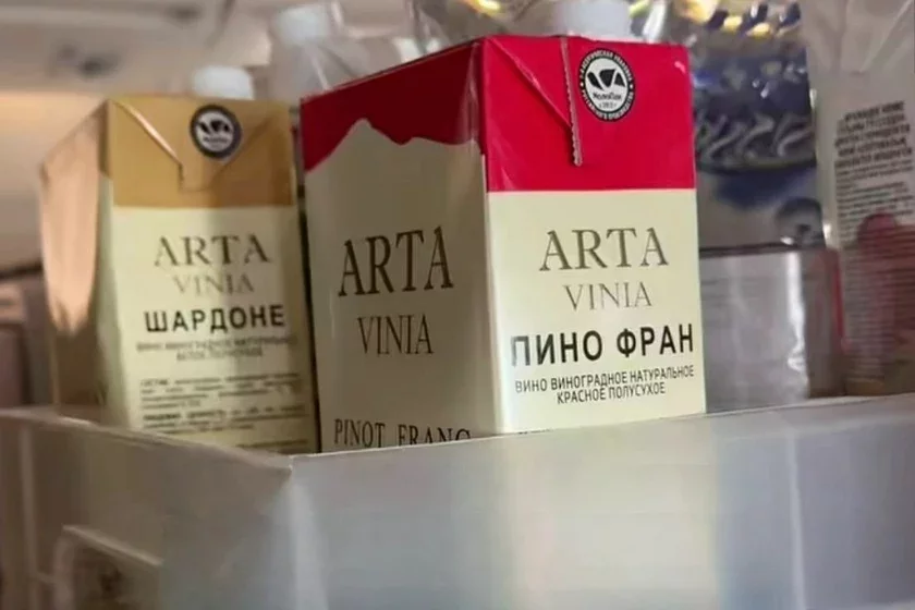 Ён жа паказаў, які алкаголь прапаноўвалі сцюардэсы. Гэта было таннае віно ў пакеце ад «Мінскага завода пеністых він» — белае сухое і чырвонае паўсухое Arta Vinia. Каментатары дадалі, што каштуе такое ў беларускіх крамах каля 8 рублёў за літр.