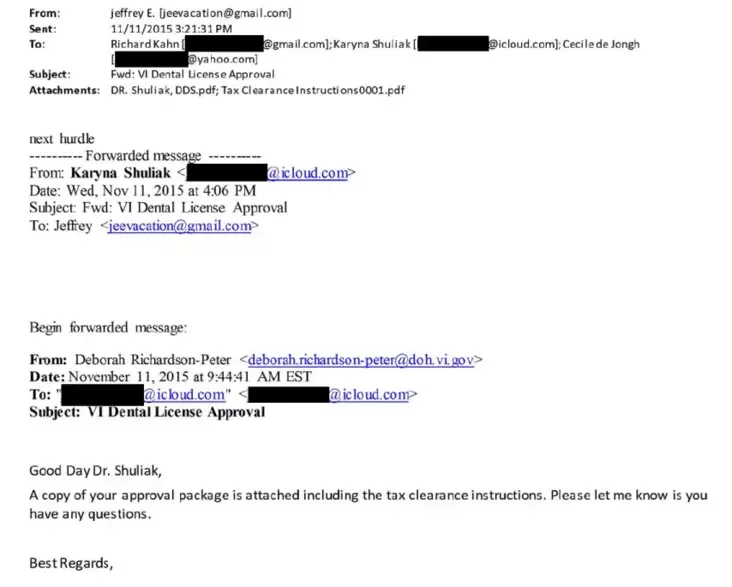 У маі Эпштейн асабіста даручыў даведацца пра ліцэнзаванне стаматолагаў, паколькі «Карына гатовая пачынаць». Фінансіст пісаў непасрэдна да Сесіль дэ Ёнг — жонкі тагачаснага губернатара Віргінскіх астравоў. Тая даслала інфармацыю, але працэс зацягнуўся.