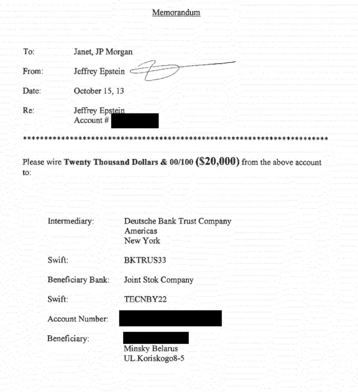 У апублікаваных судовых дакументах «Люстэрка» знайшло два плацежныя даручэнні аб пераводах грошай у Мінск. Абодва падпісаныя Джэфры Эпштэйнам.