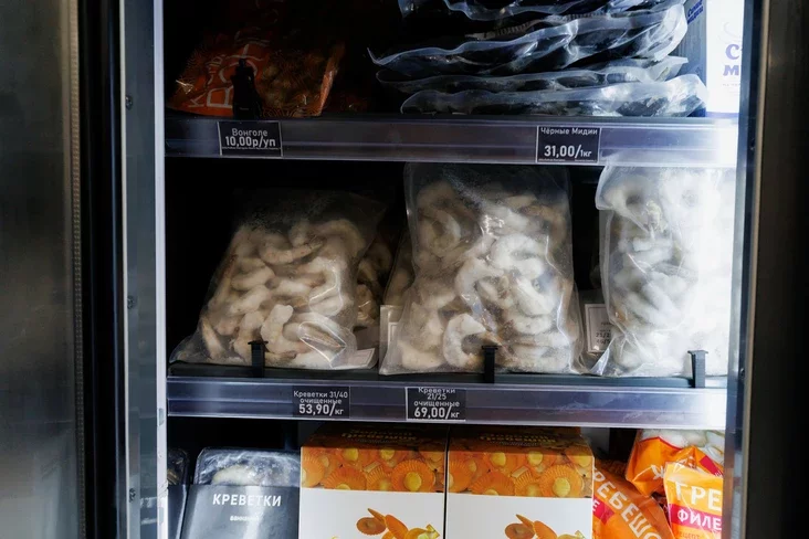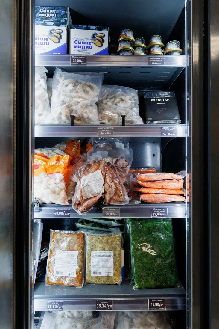 Збоку выстраіліся халадзільнікі з замарожанай рыбай і морапрадуктамі. Тут «водзяцца» вялікія крэветкі, кальмары, васьміногі, грабеньчыкі ў ракавінках, сінія і чорныя мідыі. Ёсць таксама слайсы пад карпача, смажаны вугор, медальёны і стэйкі з тунца.