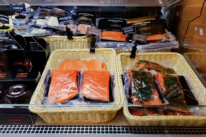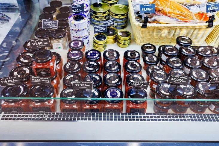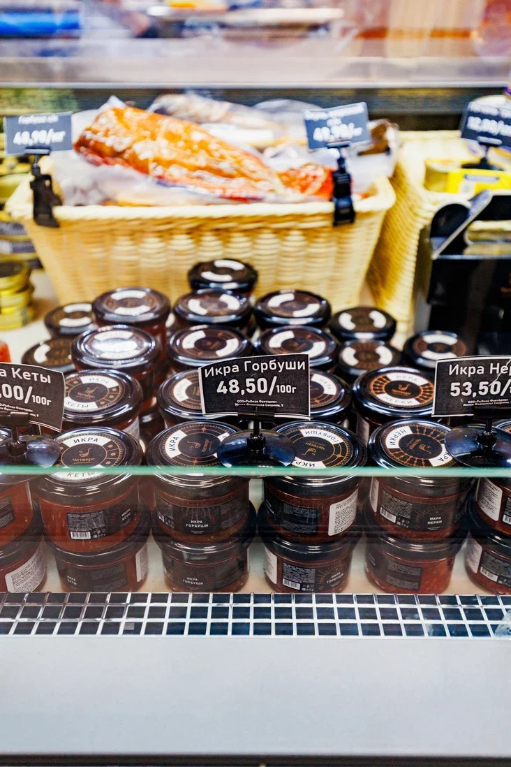 Асноўная вітрына ломіцца ад чырвонай і чорнай ікры, у тым ліку адборнай — ад 20‑гадовых асятроў. Побач выкладзена чырвоная рыба — як салёная, так і вэнджаная.